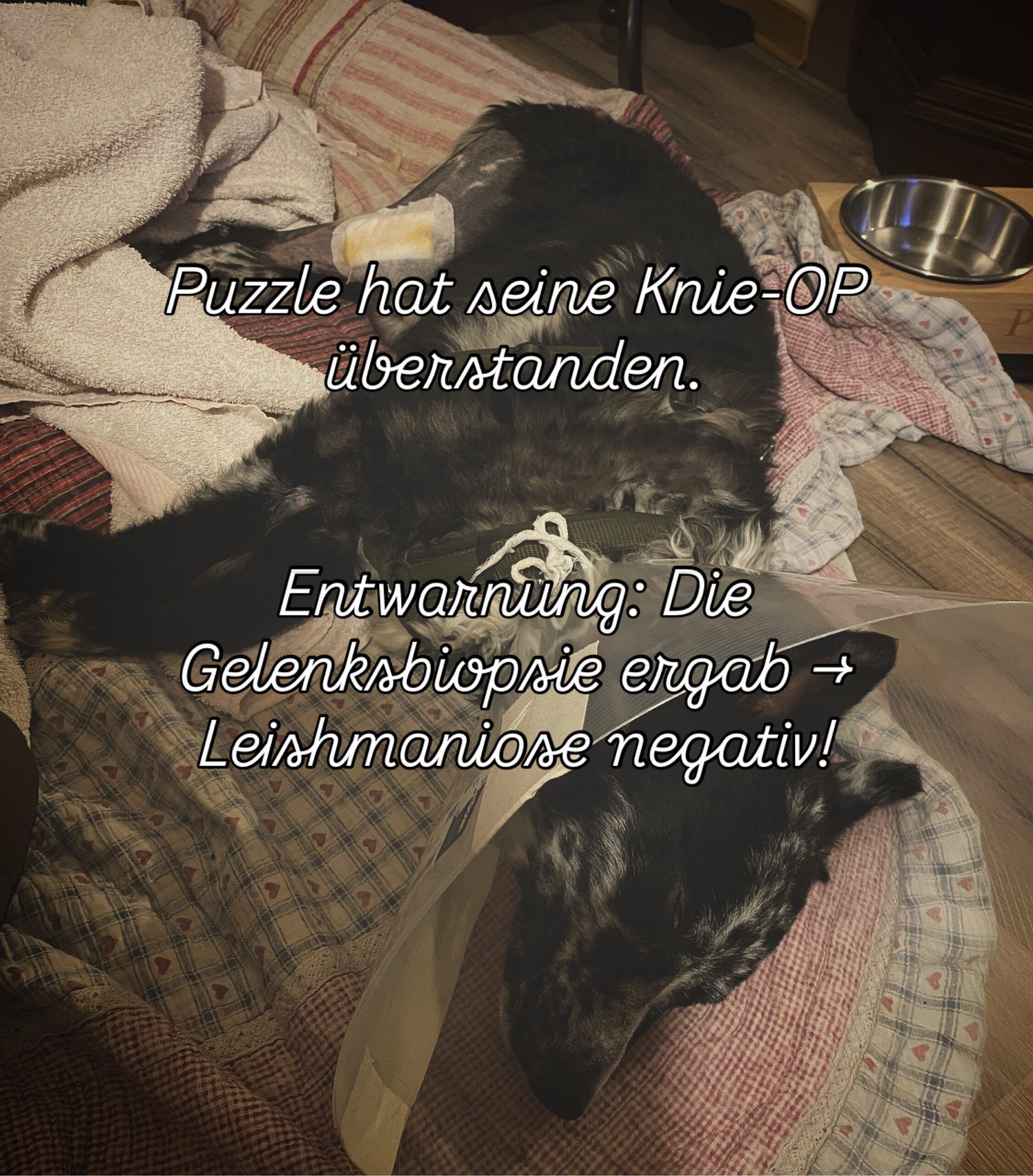 Der kleine Mudi-Rüde hat die Operation am Knie überstanden. Ein etwa 10 cm langer Nagel wurde aus seinem Knochen entfernt. Bei der Gelenksbiopsie stellte sich heraus, dass keine Leishmaniose vorliegt. Damit fällt uns natürlich ein großer Stein von der Seele. Momentan hat er noch große Schmerzen und braucht eine rundum Betreuung. Wir hoffen, dass sein Zustand sich in den nächsten Tagen bessert. Danke an alle, die dazu beigetragen haben, dass diese OP möglich war!