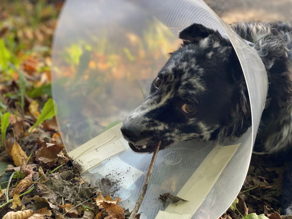Puzzle hat sich nach Tag 10 langsam an die Halskrause gewöhnt. Seine Energie kommt zurück und es wird immer schwerer ihn am Toben und Rennen zu hindern. Nach dem Wochenende werden die Fäden gezogen, dann geht es mit Physiotherapie los und wir werden nach und nach sehen, ob seine Schmerzen für immer verschwinden….