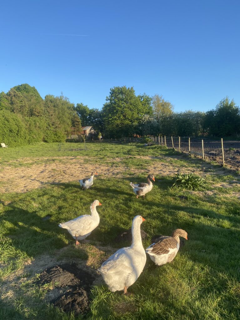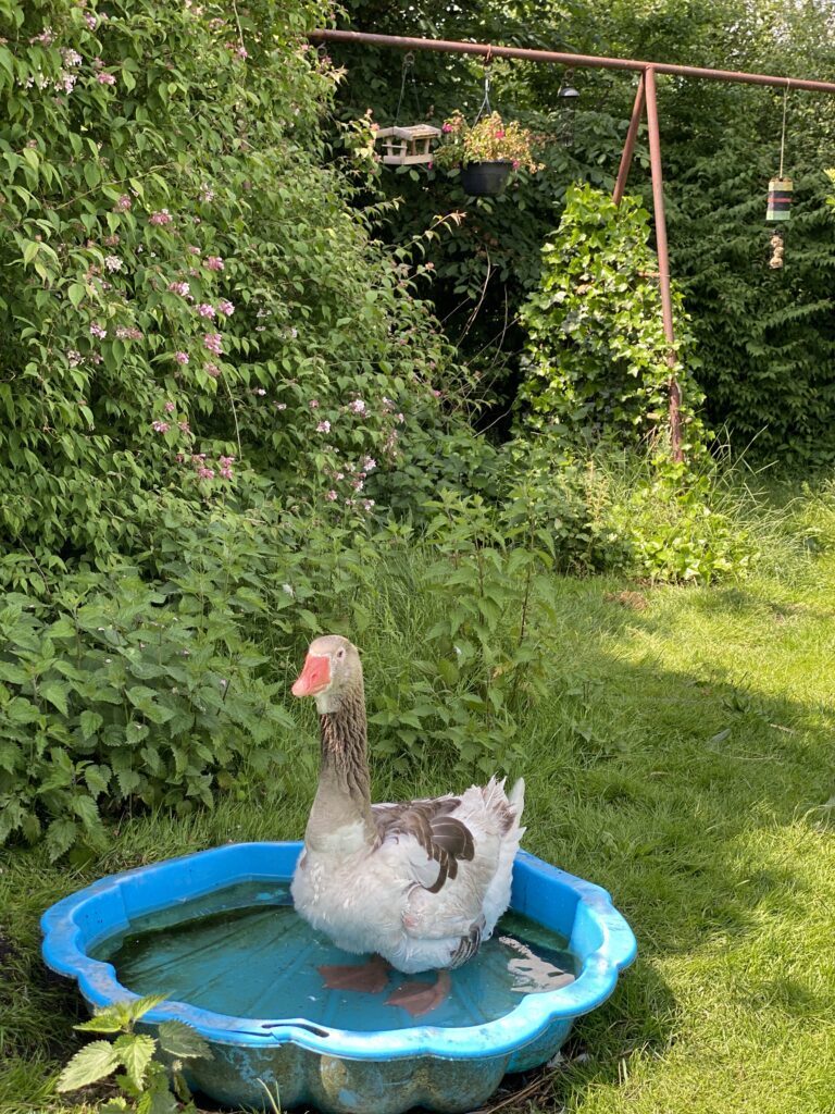 Die Gänse unterscheiden sich nicht nur im Federkleid. Jede Gans und jeder Ganter haben Charakter, soziale Gefüge, mögen es lieber allein unterwegs zu sein wie Gans Anett oder sind nur zusammen zu sehen wie das weiße Päärchen Olaf und Elsa. Opi ist der älteste der Gruppe. Manchmal bekommt er einen Höhenflug und führt die Gruppe mit erhobenem Kopf und stolzer Brust an. Manchmal ist die Gruppe von dem ganzen Machogehabe genervt und er zieht sich zu seiner Lieblingsbeschäftigung zurück…. ausgiebig baden.