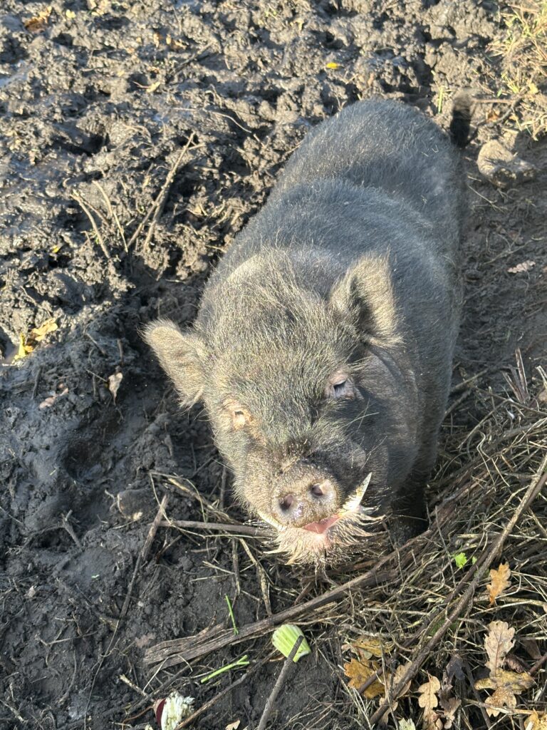 Frederic ist ein kleiner störrischer Eber, der genau weiß, was er will… und das setzt er mit vollem Körpereinsatz durch! Holzbalken, Stromlitzen, 300kg massive Schweine halten ihn dabei nicht auf. Wenn er sich in den Kopf gesetzt hat, die Minischweine zu besuchen oder im Gänsestall ein Nickerchen zu machen, dann braucht es eine Menge Überzeugungskraft, um ihn wieder zu seiner Piggeldy zurück zu bringen.
