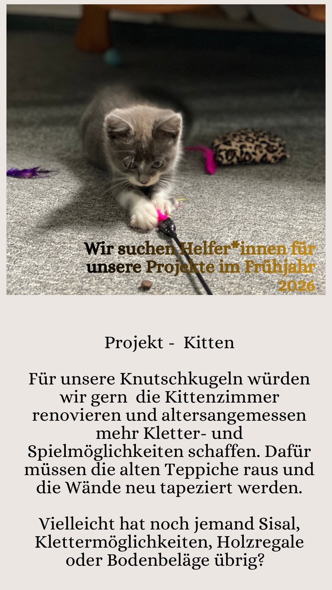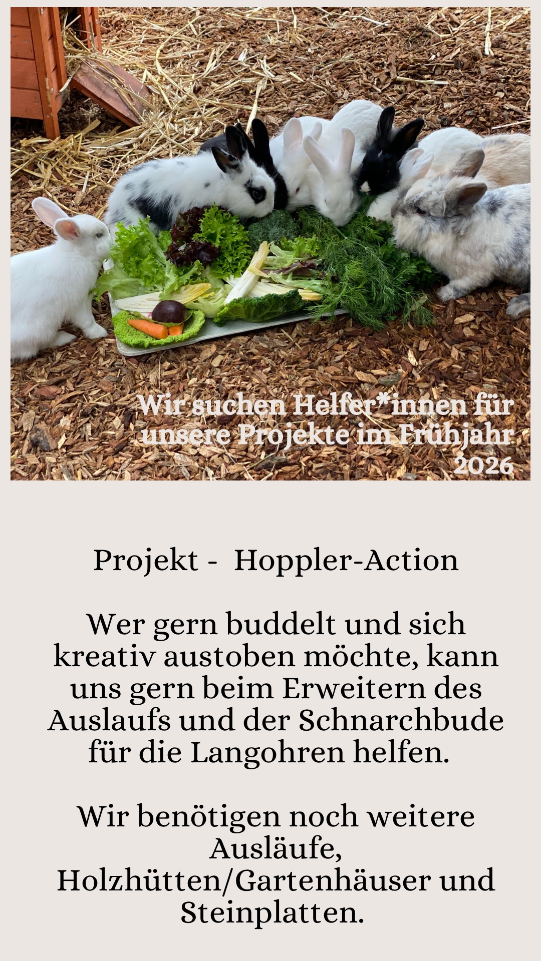 Falls du Lust oder Ideen hast, die Tiere mit deinem Beitrag zu unterstützen und ihre Lebensplätze aufzuhübschen, dann melde dich gern bei uns mit dem Hinweis auf das jeweilige Projekt und mögliche Zeiträume, die für dich passend sind.
